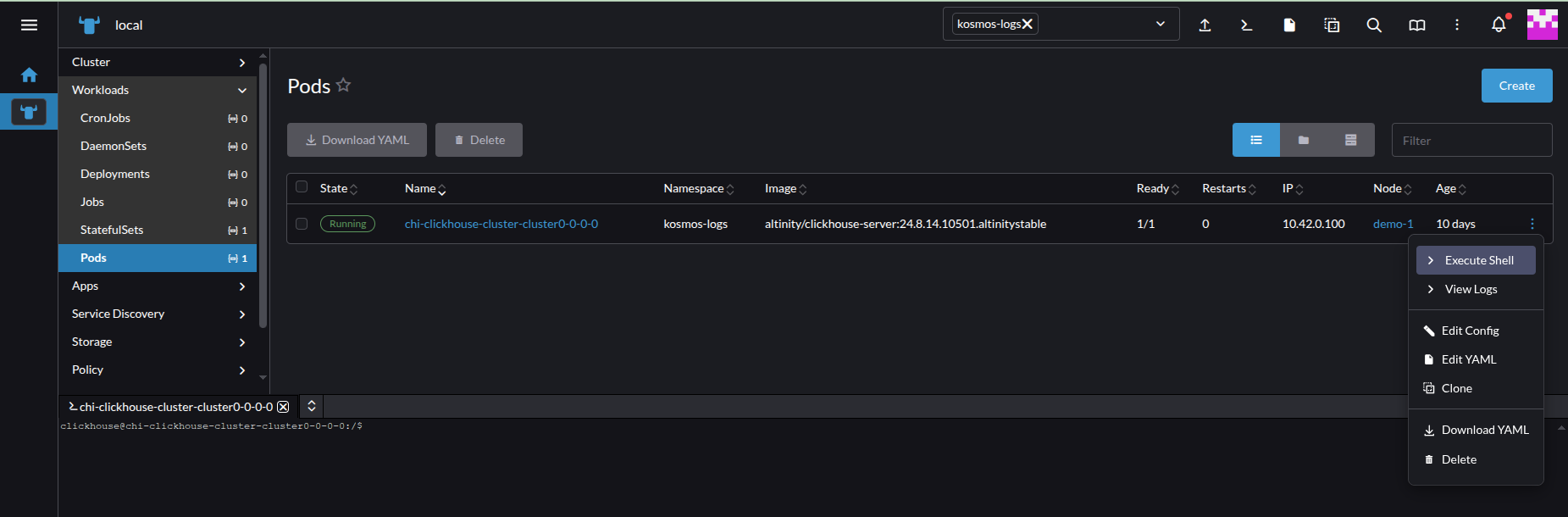 clickhouse-client -u kosmos --password <password> -h 127.0.0.1 -d kosmos